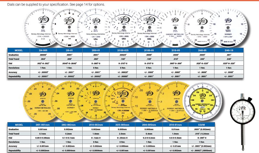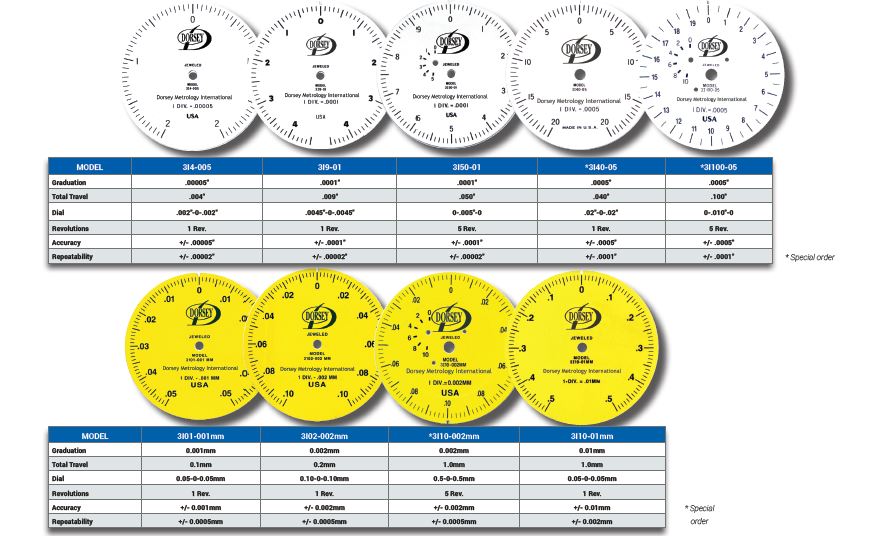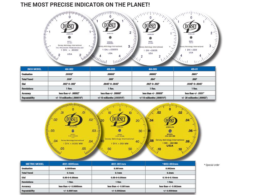 Los indicadores de dial de alta amplificaci?n de Dorsey cuentan con un movimiento de tipo "siguiente" a prueba de golpes que utiliza el exclusivo principio de palanca de amplificaci?n y peso ligero engranajes de precisi?n segmentados de baja inercia para una precisi?n y repetibilidad sin igual.